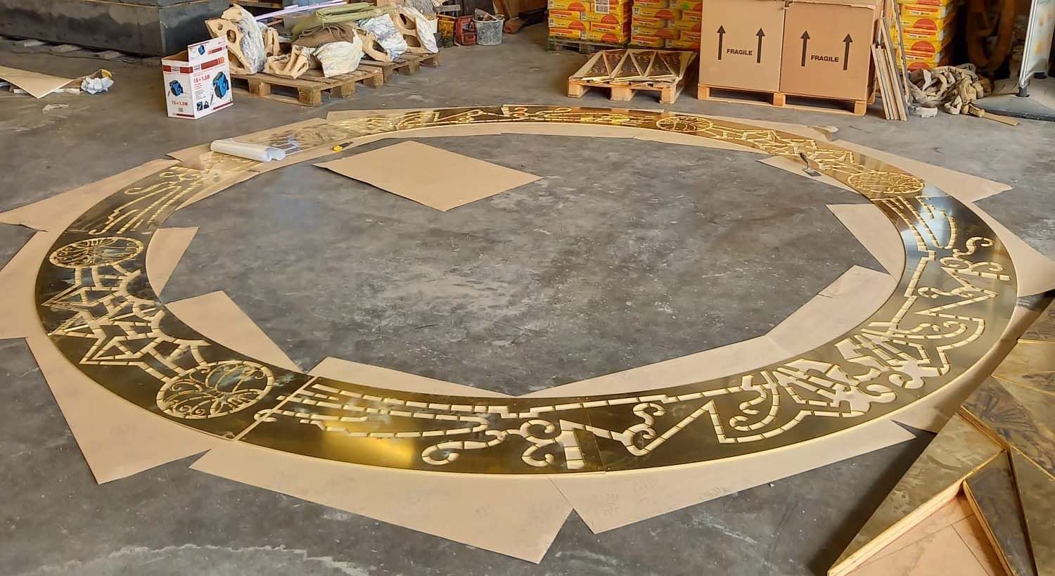 De materialen van het podium zijn: Terrazzo, messing, LED licht